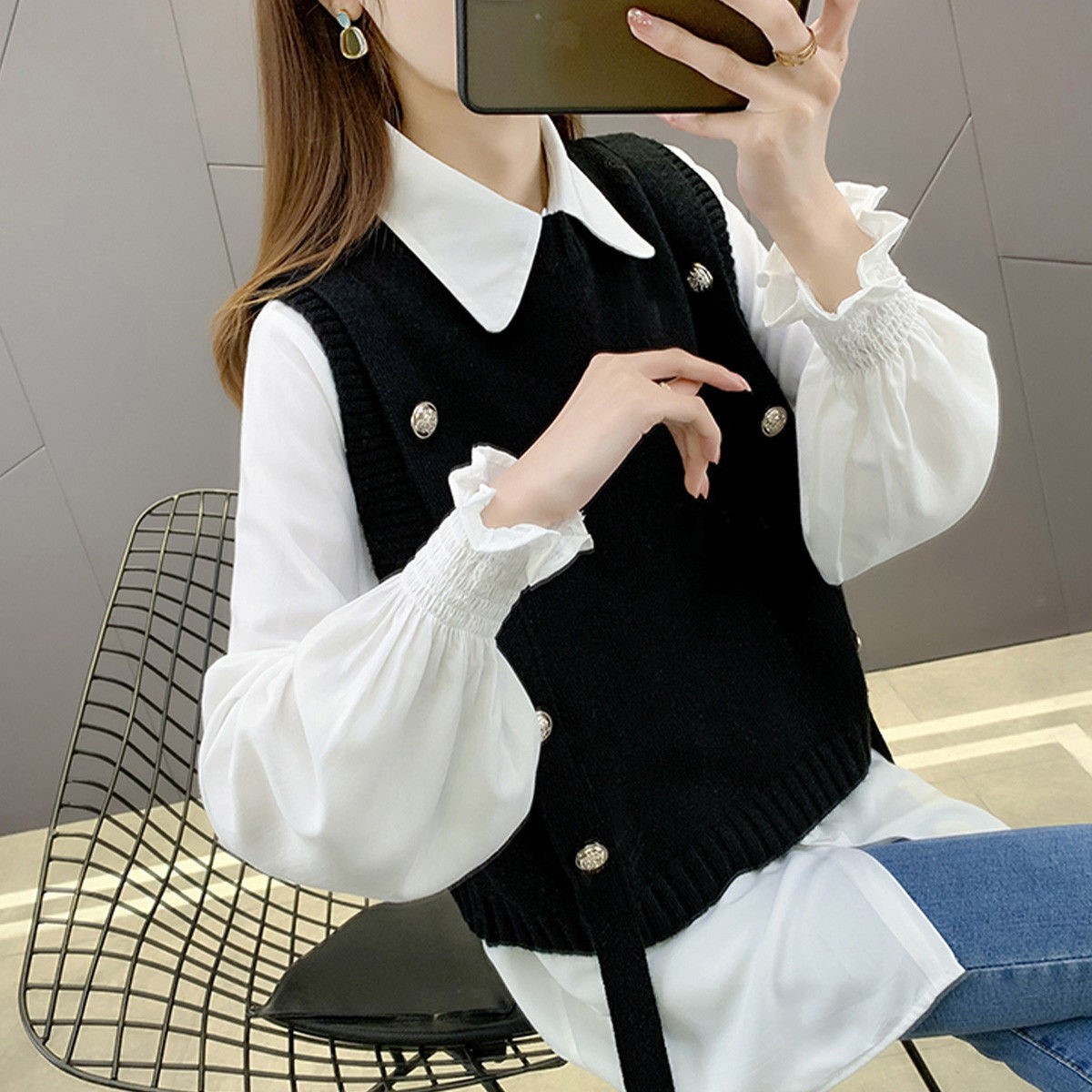 2021年新款春秋衬衫女长袖设计感套装毛衣针织马甲两件套洋气热门设计联盟服务商