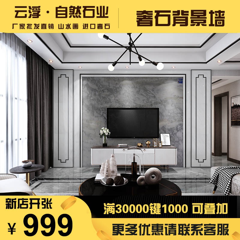 新中式电视背景墙天然山水画奢石大理石造型轻奢中式客厅影视墙。热门设计联盟服务商