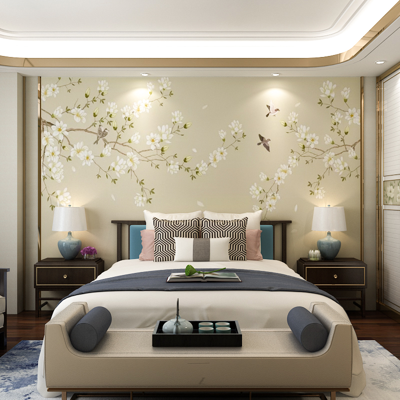 新中式花鸟立体电视背景墙卧室客厅墙纸影视墙大气装饰无缝壁画。热门设计联盟服务商