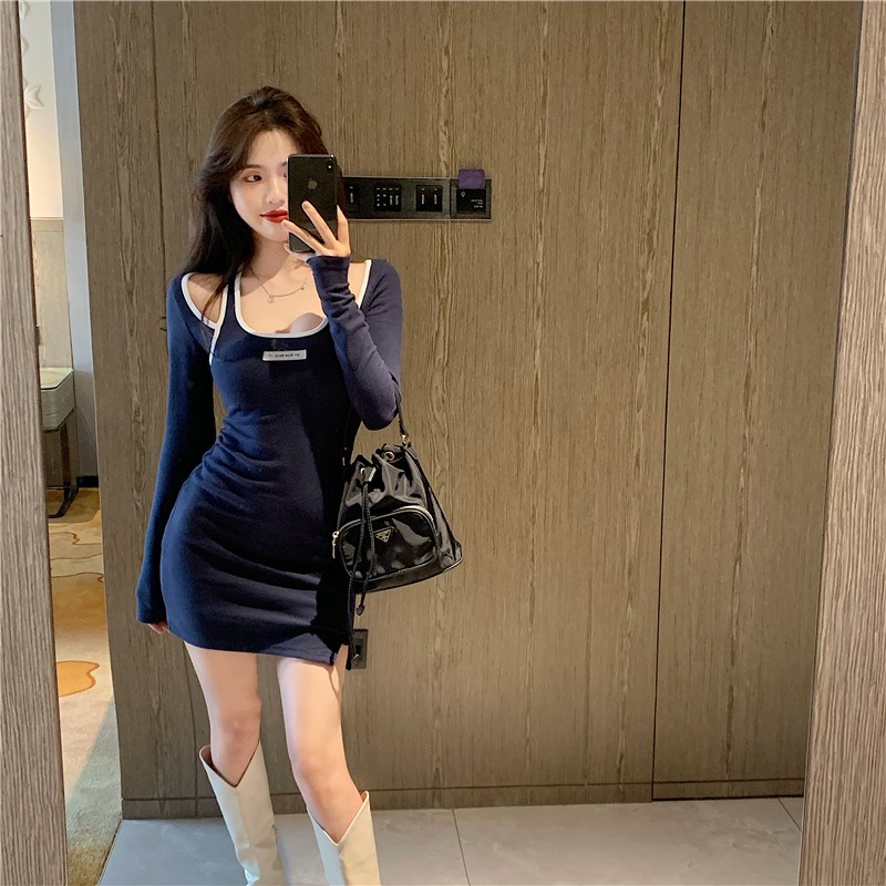 女挂欧美设计感腰包春季高脖长袖背心性感叉2021连衣裙。a开臀新热门设计联盟服务商